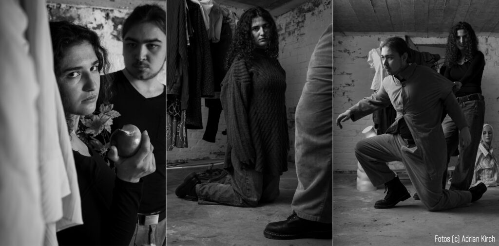 “Unertragbar” handelt von Kleidung, Bügelbrettbäuchen, Autoritäten und der Frage: “Wie viel ist dein Outfit wert?” Es wird sich in Kleiderhaufen getummelt, Adam und Eva streiten und dann ist da noch diese Stimme, die einem sagt, was mensch tragen darf und was nicht. Mit dieser neuen Stückentwicklung begibt sich das roterfaden-kollektiv collagenartig auf die Suche nach sozialen Funktionsweisen von Kleidung, ihrer Bedeutung für unsere Identität und utopischen Orten. Durch die Zusammensetzung von eigenen und Fremdtexten, klarer Bildsprache und performativen Elementen entsteht ein teils absurder, teils analytischer Abend.