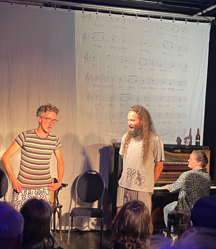 So pünktlich zur Sekunde! Heute laden wir euch ein in die guten Stuben und Wirtshäuser vergangener Zeiten – mit fast vergessenen Liedern, die wir für euch wieder zum Leben erwecken. Zwei Stimmen und Klavier – wir hoffen, ihr habt so viel Spaß wie wir. Ob Bier, ob Wein, ob Sonnen- oder Kerzenschein: lasst uns die Gläser heben: es lebe Musik, es lebe Gesang!