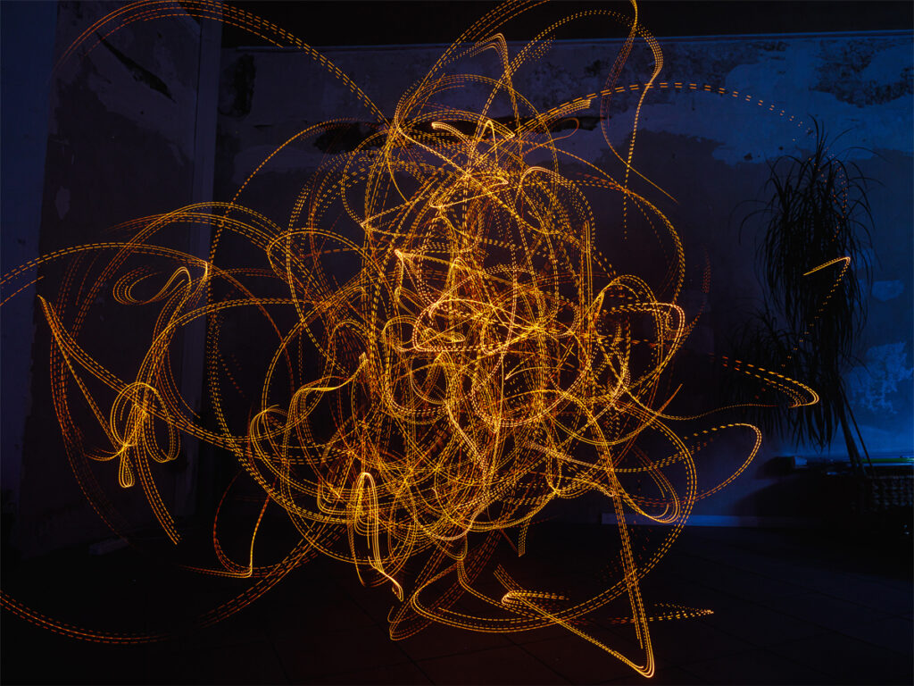 In einer assoziativen Szenenfolge bespielen die fünf Künstler*innen Lichtobjekte und machen die Frequenzen des Lichts hörbar. Damit erweitern sie die sinnliche Wahrnehmung und nehmen das Publikum mit in eine Welt der Lichtobjekte, die nicht nur visuell, sondern auch auditiv erfahrbar ist. Von meditativ bis industriell, von wabernd bis kratzend und knackend entspinnen sich unerwartete Klänge von alltäglichen Objekten wie Lichterketten, Taschenlampen oder Neonröhren. Über ihre charakteristischen Sounds und Rhythmen verwandeln sich die Lichtobjekte in die strahlenden Protagonist*innen einer Objekt-Musik-Performance, die mit individuellen Stimmen mal für sich sprechen, mal in Kontakt miteinander treten, mal mehrstimmig auftreten. So kommen sie visuell wie akustisch ins Erzählen und eröffnen Licht-Klang-Räume, die zum Eintauchen einladen.